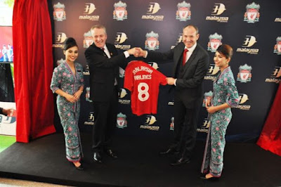 | Malaysia Airlines CEO Peter Bellew (man on the left) receives the Liverpool jersey from Liverpool’s commercial director Olly Dale to mark the official partnership. |